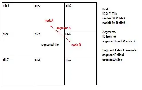 Instead of querying for a bounding box, if we store the 'names' of the tiles that each segment traverses (if it is more than just the source and destination node), we can solve the problem - for example