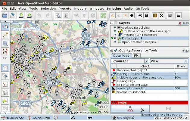- Errors download of currently observed area in JOSM, from different error detectors. The type of error can be selected from a menu or a toggle dialog, in the second case, multiple kinds of error can be downloaded at once.