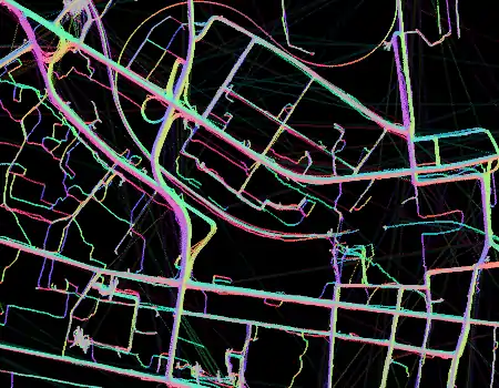Визуализация GPS-треков в центре Пензы (примерно 160 штук, 100 000 точек). На конец 2013 года всего по городу выложено около 900 треков, это порядка миллиона точек. Покрытие хорошо видно на интерактивной карте.