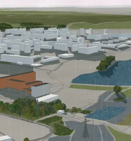 • Карта F4 (+ Западная и Арбеково) — полностью трёхмерный вид: здания с разной этажностью и формой крыш, ЛЭП, деревья, заборы, волны на воде, тени от объектов с учётом положения солнца, текущая погода.