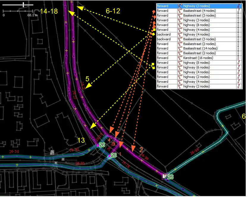 - 10-17 линии для маршрута из точки 30 в 26. Обратите внимание, что JOSM не может показать, что они непрерывны, потому что для JOSM эта развилка (ветка) начинается далеко (то есть JOSM не может найти связь с остальной частью маршрута). Когда эти элементы меняются местами, они кажутся непрерывными (и даже весь маршрут кажется непрерывным), но тогда весь маршрут больше не может быть перевёрнут и по-прежнему дает действительный маршрут. Таким образом, хотя это выглядит странно, это правильный порядок для этих участников маршрута.