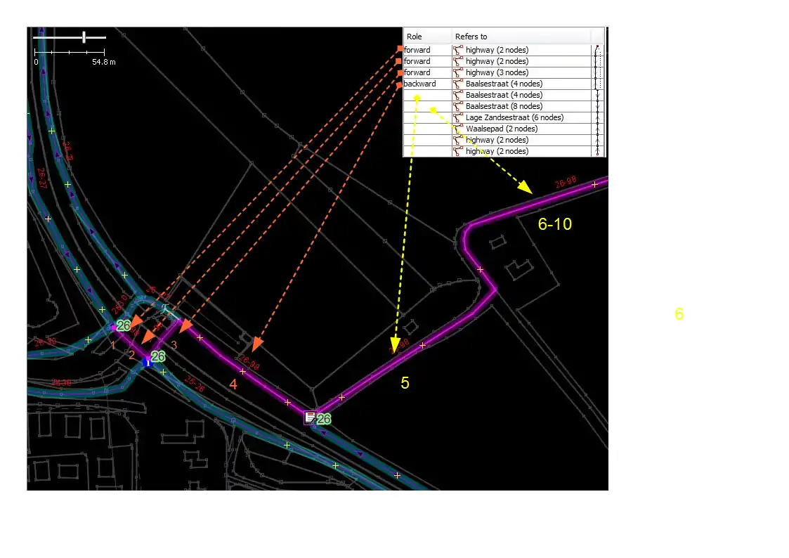 - Все линии, составляющие маршрут между двумя точками соединения, с соответствующими ролями forward/backward, если необходимо (используются разные линии, перехода с xx-yy, чем с yy-xx, нет необходимости добавлять роли на перекрёстках с круговым движением, которые используются для обоих направлений движения). Все эти роли означают, что основная линия следует в направлении его стрелок для этой конкретной ветви маршрута.
