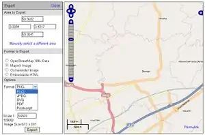 Вы можете воспользоваться закладкой 'Экспорт' на основной странице, чтобы перенести часть карты или данных карты в другое место. Закладка экспорт позволяет выделить область карты на экране для переноса или, если вы не выделите ничего — перенесет всю видимую часть карты (если только область не превысит допустимый размер).