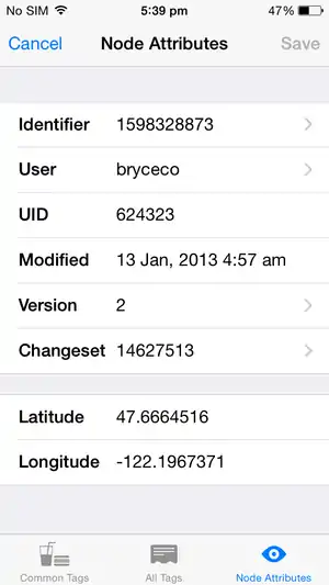 На третьей вкладке (Node Attributes) отображаются метаданные об объекте: кто и когда его создал, а так же дополнительные сведения. С этого экрана вы также можете перейти к информации, хранящейся на сервере OSM, о пользователе, наборе изменений, истории объектов и деталях объекта: