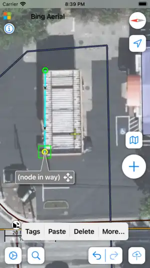 Чтобы создать новую точку или POI, нажмите кнопку "+". На экране появится индикатор позиции новой точки. Перетащите ее (используя серую рамку заголовка) в нужное место и нажмите кнопку «Tags» для добавления тегов. Если вы не добавите теги, созданная вами точка не сохранится.