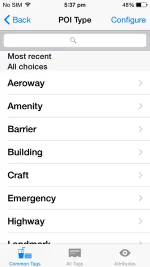 Теги используются для описания объектов в базе данных OpenStreetMap, например, для указания, что в этом месте находится магазин или ресторан с таким-то названием. Чтобы выбрать существующий объект, будь-то точка, или линия, просто коснитесь его. Чтобы выбрать здание, вы должны выбрать контурную линию, а не пытаться нажать в центр. Выбранные объекты выделятся другим, более ярким цветом, появится заголовок (рамка серого цвета) и дополнительные кнопки конфигурации. Нажмите кнопку «Tags», чтобы просмотреть и отредактировать теги выделенного объекта. Экран редактирования тегов имеет три дополнительные вкладки.
