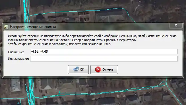 Откроется окно с парой чисел. Отодвиньте его, и двигайте карту левой кнопкой мыши, чтобы пучки треков как можно точнее легли на дороги.