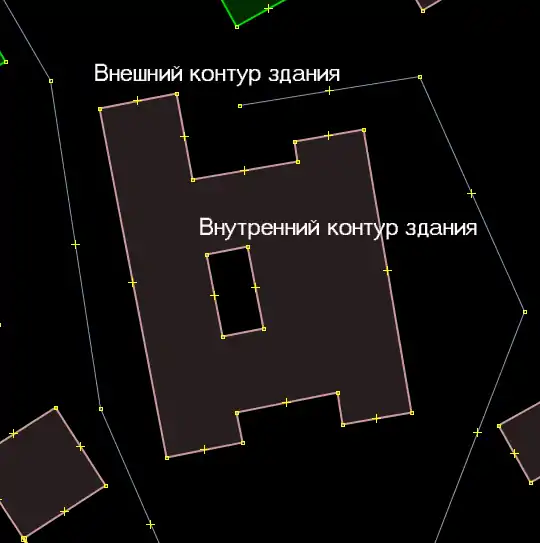 Здания имеющие внутренний двор, отмечаются при помощи отношения мультиполигона.