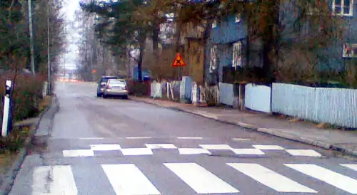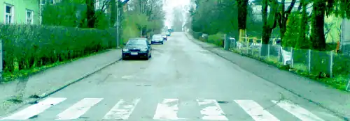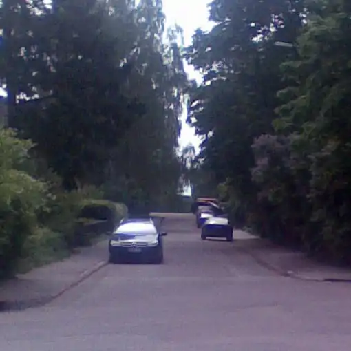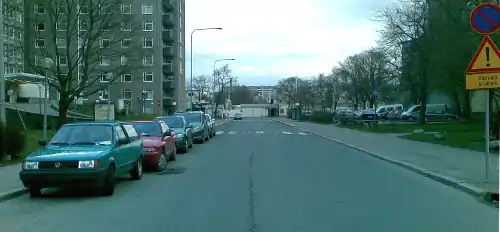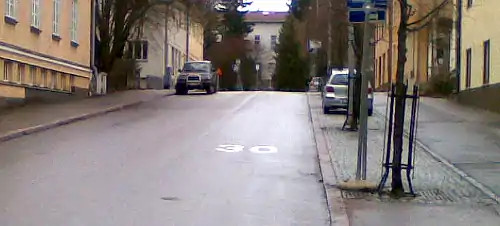 Левая сторона оказывается пустой. Трафик небольшой, поэтому двухстороннее движение (практически) свободно, независимо от припаркованных автомобилей, даже если две машины не могут проезжать друг друга в местах, где они припаркованы. Если бы машины были припаркованы с двух сторон, навигация была бы медленнее. Оценить ширину дороги сложнее, чем отличить это от следующего изображения. |