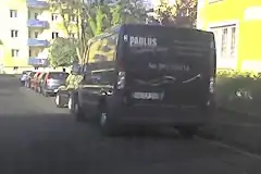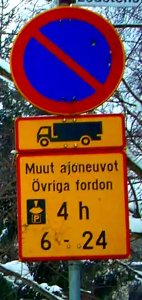|Знак гласит (перевод) «Не распространяется на погрузочно-разгрузочные фургоны и грузовые автомобили».