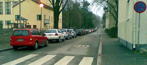 То же, что и выше, но изображение получше. Парковка бесплатна с обеих сторон, но не разрешена с обеих сторон в одном месте, потому что в этом случае автомобиль или грузовик не сможет проехать. |