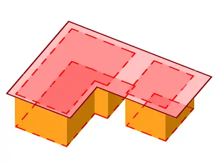 Пунктирная линия - это проекция здания на первом этаже. Как вы можете видеть, он меньше контура крыши, полученного с аэрофотоснимка. Схема здания на первом этаже должна быть правильно маркирована, например: