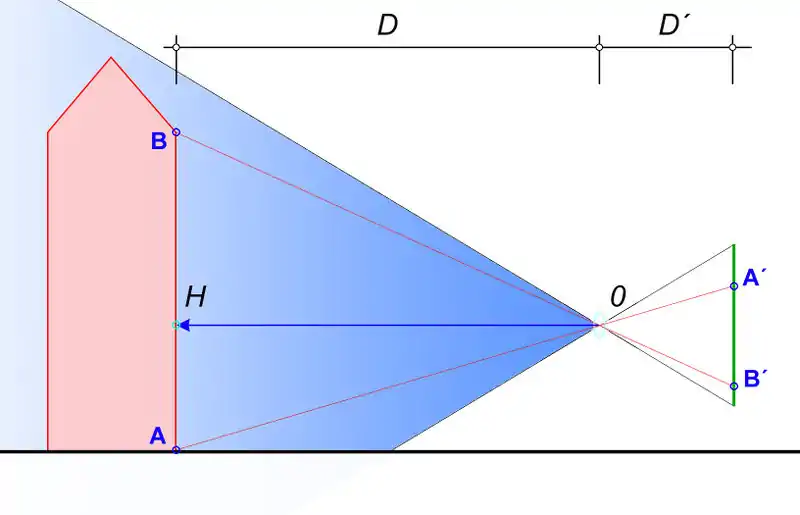 так как высоту He 'и H можно измерить по фотографии: H / He = H' / He ', поэтому H = (H' / He ') * He