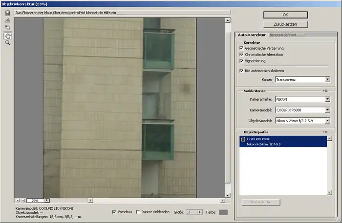Eine komfortable Möglichkeit für Adobe Photoshop User bildet der Filter Objektivkorrektur (Umschalt+Strg+R) Man kann dort Parameter der Kamera und Objektives eintragen, wodurch die Bearbeitung wesentlich erleichtert wird: