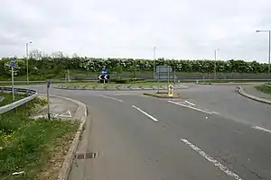 - Мини-кольцевая развязка — это улица с односторонним движением с преимущественное право проезда и проходимым центральным островком ". В частности, крупногабаритным транспортным средствам разрешается проезжать через центральный остров, если иное невозможно из-за их габаритов, т.е. крупногабаритному транспортному средству может быть невозможно проехать по кольцевой развязке, но возможно проехать по мини-кольцевой развязке с теми же габаритами.