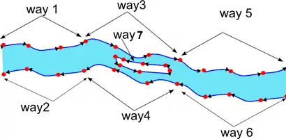 Кроме того, линия помеченная тегом waterway=river (на рисунке это линия 4) должна быть нарисована в направлении течения реки (от источника к морю).