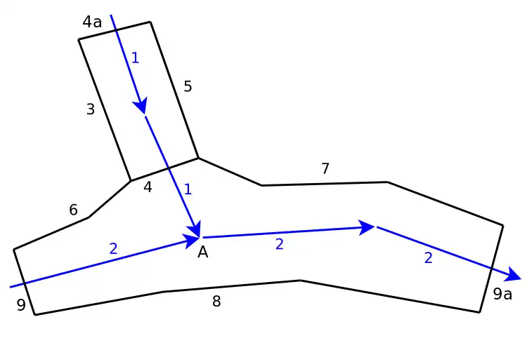 - Мультиполигон с аккуратным тегированием берегов - Обе реки следует обозначить при помощи тегов type=multipolygon + natural=water + water=river + name=* + ... Затем, в дополнение к мультиполигональному тегированию, отдельные линии в секторах c 3 по 8 помечаются тегом waterway=riverbank, исключая сектор 4, который не является берегом. (Имейте в виду, что хотя использование тега waterway=riverbank на линиях лучше сочетается со значением слова riverbank (берег) в естественном языке, употребление данного тега противоречит устоявшейся традиции, согласно которой он должен применяться на полигоны. Так что пользуйтесь данной интерпретацией на свой страх и риск. Вы также можете использовать тег natural=riverbank, чтобы обойти эту двусмысленность.)