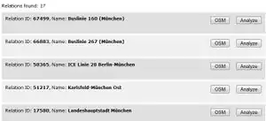 At the same time you can extract a relation as a GPX or KML file for your GPS device or view it directly in the OSM map. The export for navigation only makes sense if the relation is in one piece. Additionally it supports the JOSM RemoteControl, so you can find and fix the relation gaps (bugs) right away! Use the search function to find a relation by name.