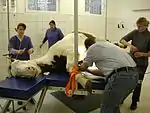 A paddock box is a stall (box) for a horse with a very small adjacent outdoor enclosure which grants access to the open air but does not allow grazing. A paddock box is tagged just like a stable with an adjacent paddock area. | ![]() | |