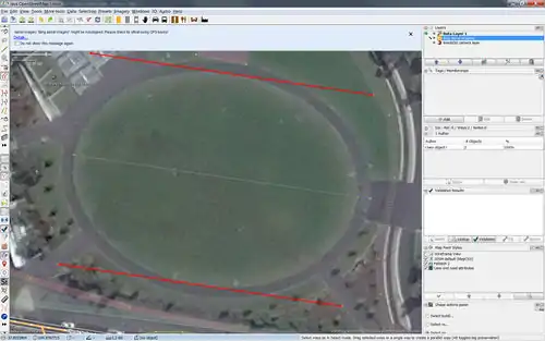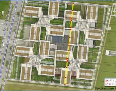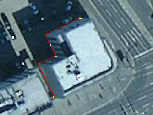 - A construction line parallel to the (right image in this example) the outer edge of the building is drawn and placed on the outside edge of building on the aerial photograph: