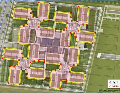 Therefore, when drawing buildings from poorer quality aerial imagery, it is wise to assess whether each building is likely to have right angles on the ground, or whether the corners possibly aren't such. Prior knowledge of the settlement's history, and of the architect's style of choice, can be valuable when making this assessment.