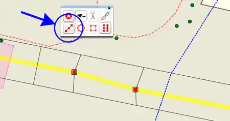 Situation: Some adjacent buildings (as an example here downtown, old buildings). We see the outer walls of the buildings are in fact a straight line, but in the drawing shape it is "almost" straight. To straighten these edges, we draw an auxiliary line, touching all points of this curve. It is necessary that at least one endpoint is outside this line to straighten the walls: