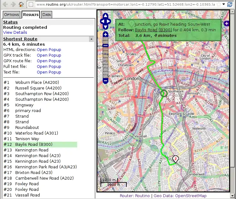 The routing preferences default to the a pre-determined set depending on the transport type selected. These can then be edited before the route is calculated. Selecting one of the "Shortest" or "Quickest" buttons will calculate the route and display the results. The route is displayed on the map and by moving the mouse over the route description each important junction can be highlighted on the map with a description of it.