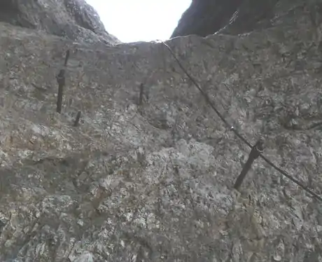 On many hiking trails through mountainous areas, dangerous or difficult sections are secured by technical means like steel cables, fixed ropes, ladders, or rungs.