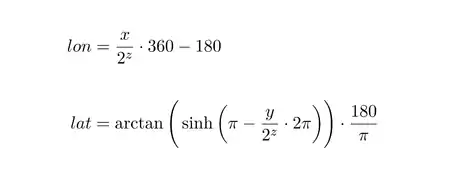 n = 2 ^ zoom lon_deg = xtile / n * 360.0 - 180.0 lat_rad = arctan(sinh(π * (1 - 2 * ytile / n))) lat_deg = lat_rad * 180.0 / π