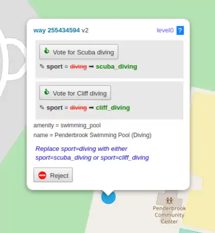 In some cases, we cannot describe the change in terms off accept vs reject. Instead, we have a set of well known choices, and allow users to research and choose the correct one, or reject them all. For example, sport=diving has been deprecated and needs to be replaced with either sport=scuba_diving or sport=cliff_diving.