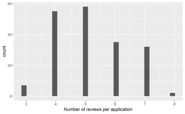 The initial plan was to have 80 reviews per reviewer to get at coverage of at least 5 reviews per applicant. This did not work out as initially planned, as some reviewers did not manage to score their 80 assigned applications. In the end, each of the 189 applications was reviewed by at least 3 persons.