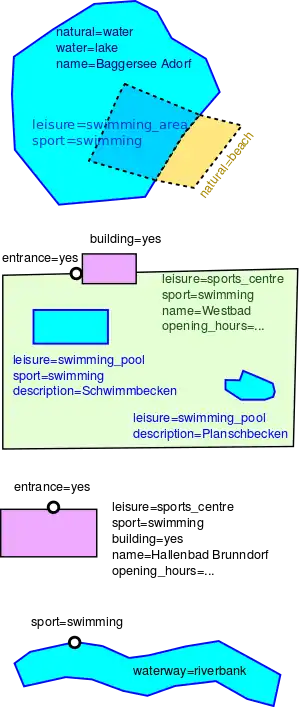 In general we have the water area of a swimming pool and the facility itself. The facility can be swimming or bathing oriented. A Way is drawn around the perimeter (including meadow, playgrounds, buildings, and if you want to also parking areas).