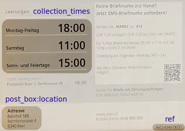 | post_box:location=* | optional | Each post box has an address in the bottom left corner. | post_box:location=Bahnhof SBB, Bahnhofstrasse 4, 6340 Baar |