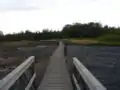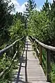 boardwalk or plank walkway over wet or otherwise difficult terrain, usually low to the ground and supported by posts.