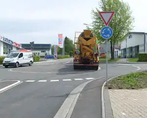 - A mini-roundabout is a one-way street with right-of-way and a traversable centre island. In particular, large vehicles are allowed to drive across the centre island if otherwise not possible due to their dimensions, i.e. it might be impossible for a large vehicle to drive through a roundabout but possible to drive through a mini-roundabout with the same dimensions.