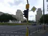 In addition, the major and minor road should intersect in one node only, typically in an acute angle. An example is the Strausberger Platz in Berlin, Germany. Such junctions can be tagged junction=circular.