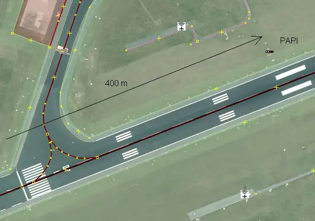 You will find the PAPI about 400 m behind the beginning of the runway, mostly on the left side. Good satellite images show 4 floodlights in a row. Add a node in the middle of the system.