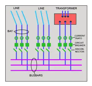There is normally one set of busbars per voltage level, with the higher-voltage busbar being the largest and most visible due to the larger conductor spacing. Bays are lines which run off the busbar to connect to transformers or power lines, usually via a combination of circuit breakers, disconnectors, and instrument transformers.