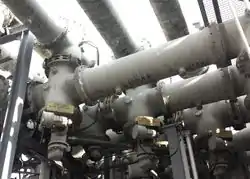 400 kV busbar coupling dual circuit-breaker. Such devices actually use SF6 as insulation gas. |