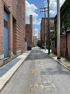 | Ploy Street, alley street with a narrow sidewalk highway=service + service=alley + sidewalk=both + surface=asphalt | ![]() Ploy Street, an alley street in the Mt. Vernon Area of Baltimore |