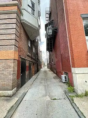 Alley streets are a road classification found in Baltimore, Maryland, USA[1], and potentially other places. Alley streets are alleys by definition, i.e., they serve the rear of buildings, but are named. Most named alley streets have addresses assigned to them, often small homes or carriage-houses that have been converted into homes, due to Next Generation 911 (NG911) standards that require local governments to sign any public street with addresses. Alley streets may have sidewalks but they are small and designed to house trash cans or steps down from homes. Alley streets do not typically have on-street parking, which distinguishes them from residential streets.