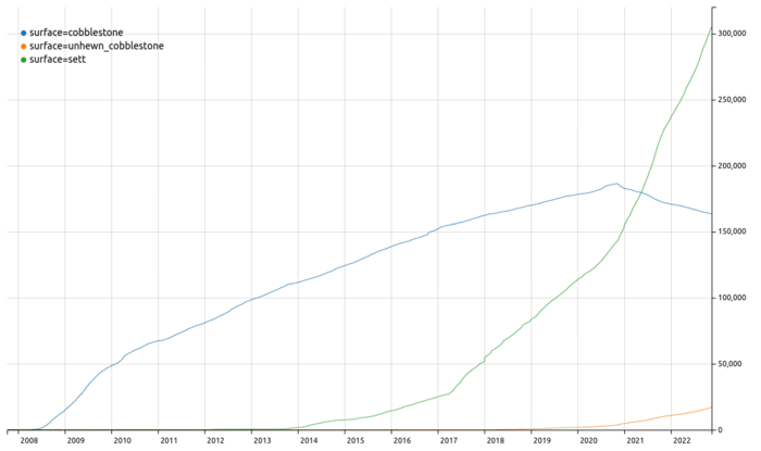 surface=cobblestone decrease since that time is driven in large part by StreetComplete treating it as surface that needs resurvey (and asking user to specify it and giving surface=unhewn_cobblestone and surface=sett among options).