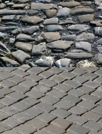 | surface | paving_stones | Paving stones have relatively smooth surface. The surface is paved with artificial blocks (block pavers, bricks) or natural stones (flagstones), with a flat top. The gaps between individual paving stones are very narrow, either because the stones have a perfectly regular shape (rectangular, or any surface-filling shape) or because they have been carefully selected, fitted and placed in order to form an even, closed surface. | ![]() ![]() |