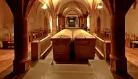 crypt is a stone chamber beneath the floor of a church or other building. It typically contains coffins, sarcophagi, or religious relics.