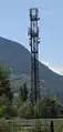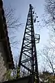 The tower is constructed of a latticework, consisting of a criss-crossed pattern of strips of building material.
