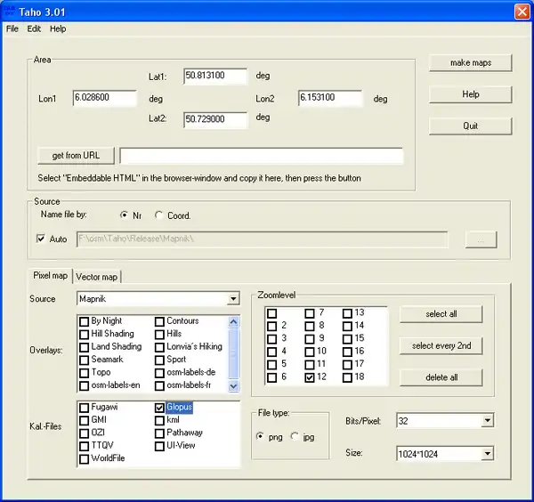 Both can download maps in different sizes (1024*1024 to 8192*8192) for an area of any size. For each map calibration files in the following formats can be produced: