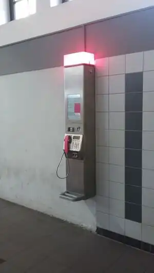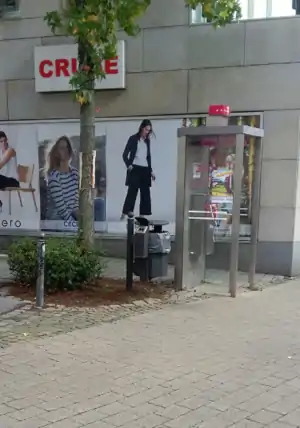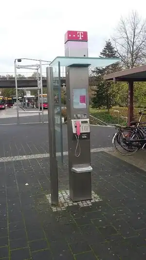 ![]() Eine Telefonsäule des Typs Telestation Wandversion. ![]() Weitere Telestation Wandversion. Der Aufkleber im oberen Bereich der Säule zeigt an, dass es hier einen WLAN-Hotspot gibt. Bei diesen Telefonsäulen fehlt der Aufkleber aber häufiger mal und es gibt trotzdem WLAN. |