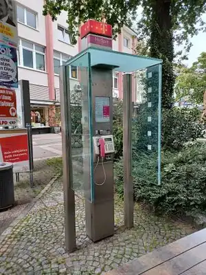 ![]() Eine Telefonzelle des Typs TelH 90. ![]() Dieser Standort ist mit einem WLAN-Hotspot ausgestattet, was der Aufkleber im oberen Bereich der Zelle anzeigt. Manchmal fehlt dieser Aufkleber aber auch und es gibt trotzdem WLAN. |