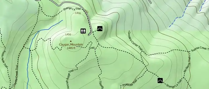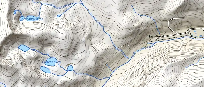Hillshading and contour lines are derived from the 1/3 arc-second National Elevation Dataset from USGS. The hillshading layer is color-coded with a typical green/brown/white gradient by elevation. Additionally, on higher zoom levels, contour lines are available with 50 ft intervals with a major contour line every 250 ft. Contour lines are marked with elevation labels, in feet.