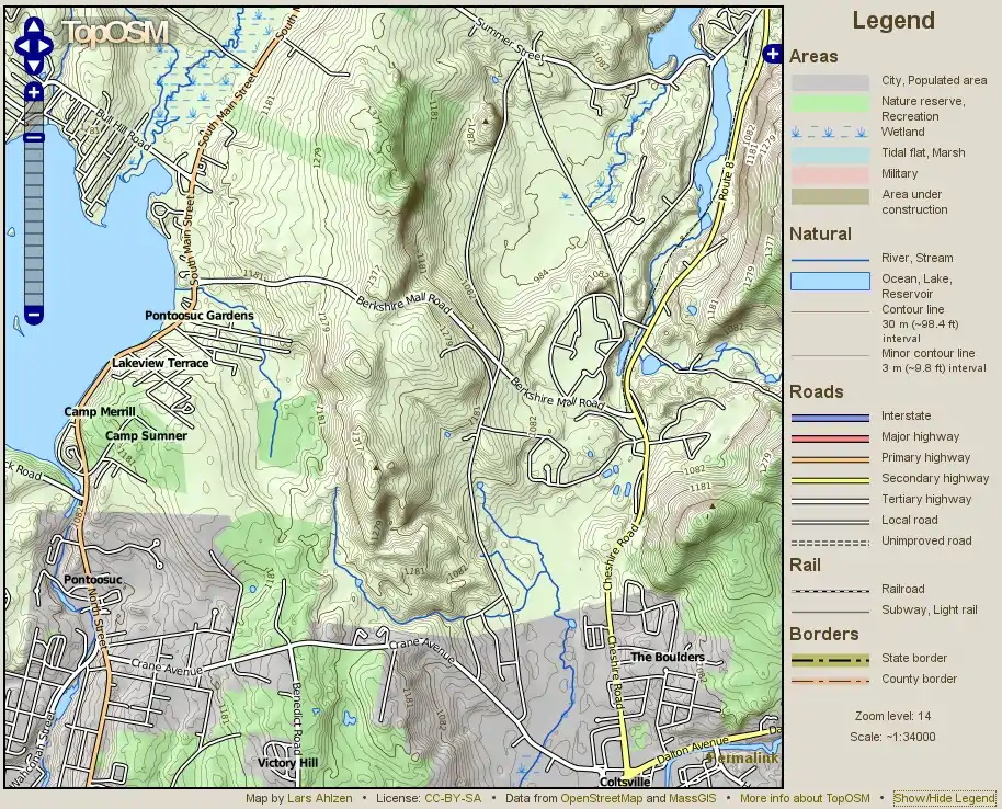 The map features both contour lines and relief shading derived from data sources such as the USGS National Elevation Dataset, MassGIS and SRTM. Hydrographic features, such as lakes, rivers and wetlands, come from the USGS National Hydrographic Dataset and MassGIS. Roads, place names and all other map features are from the OpenStreetMap project.